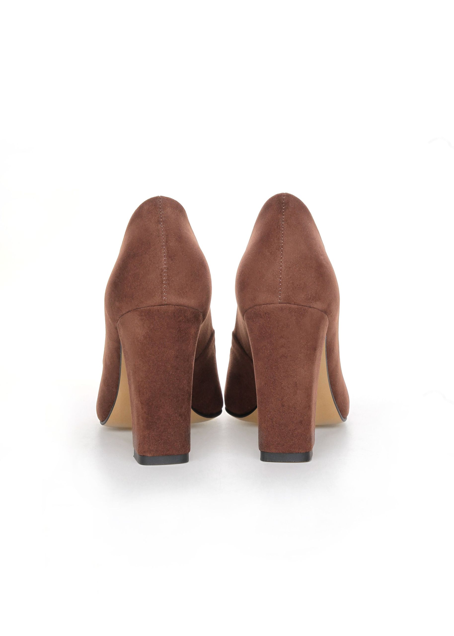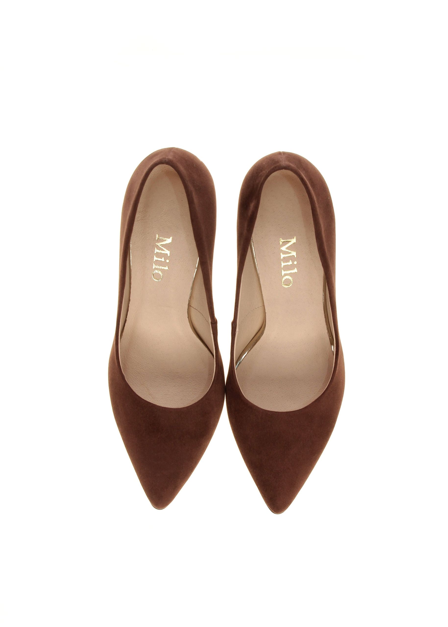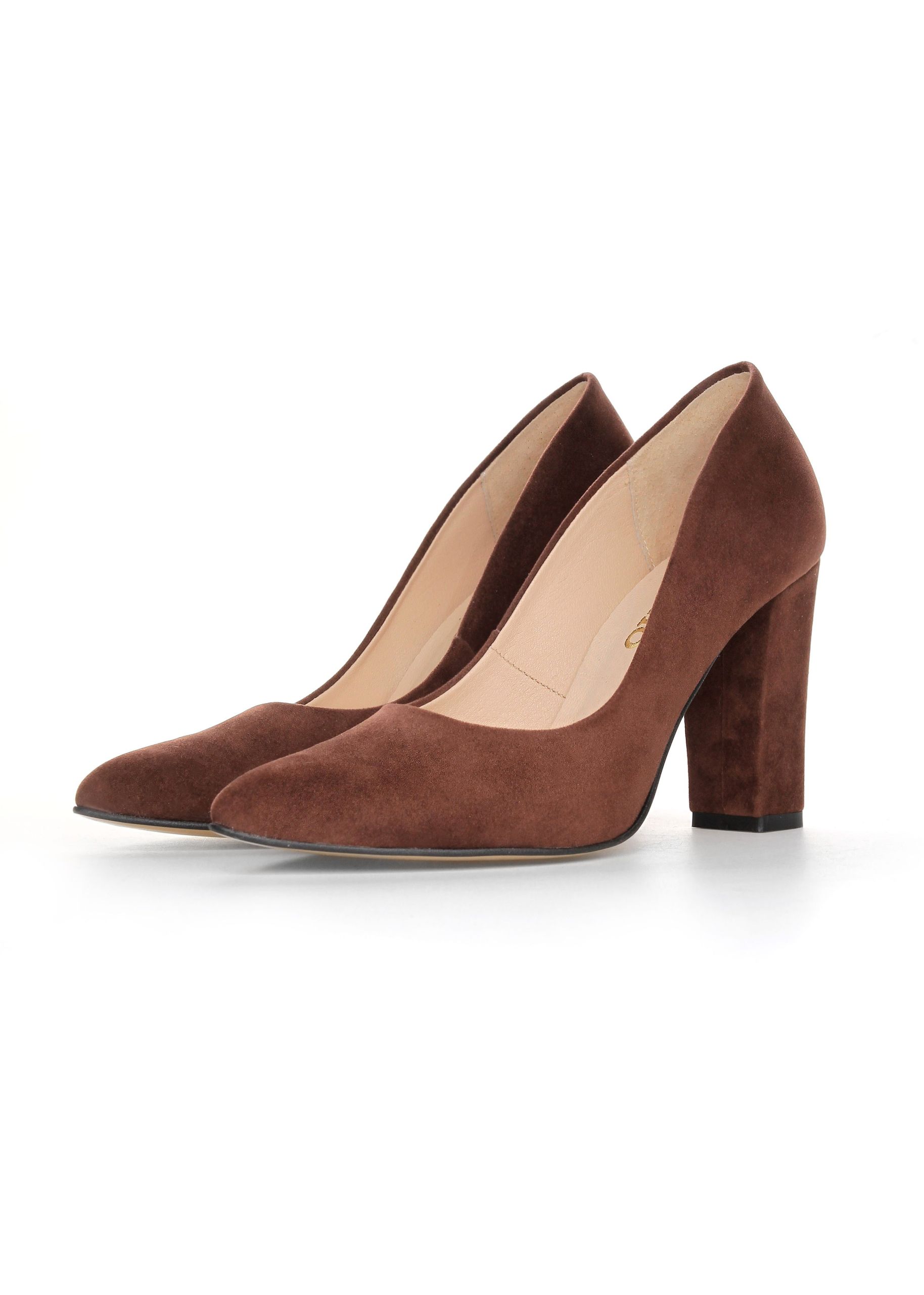 Klasyczne zamszowe czółenka na słupku w kolorze czekoladowego brązu
