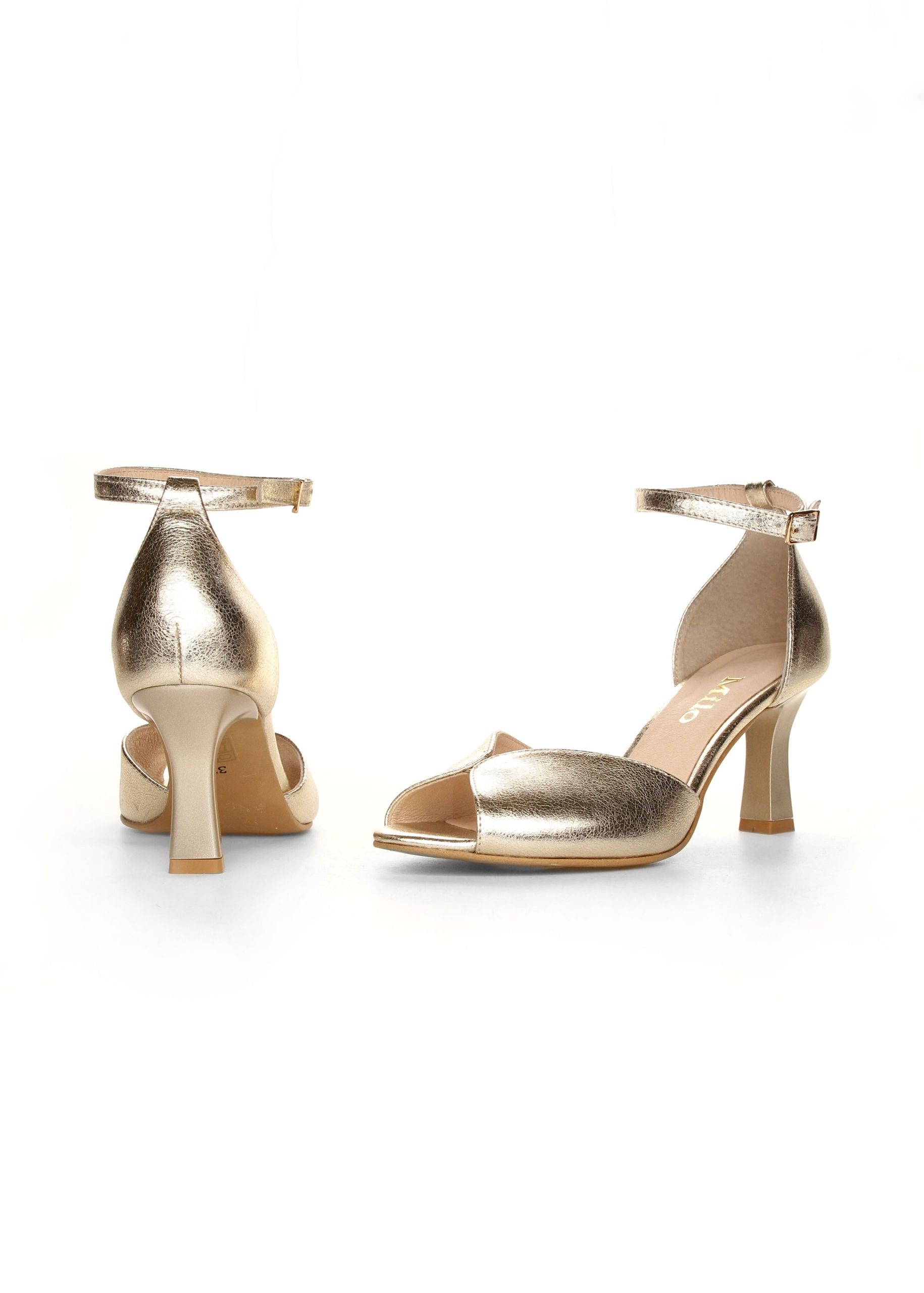 Efektowne Wykończenie: Kolor "złoty kryształ" charakteryzuje się subtelną, ziarnistą strukturą, która pięknie odbija światło, nadając butom biżuteryjnego charakteru.
